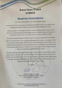 Mariana Krásnolipská je od 17. 9. 2025 oficiálně certifikovaná jako Team Coach Tiimiakatemia®. A to znamená, že už může podle metodiky Tiimiakatemia vést studentské týmy.