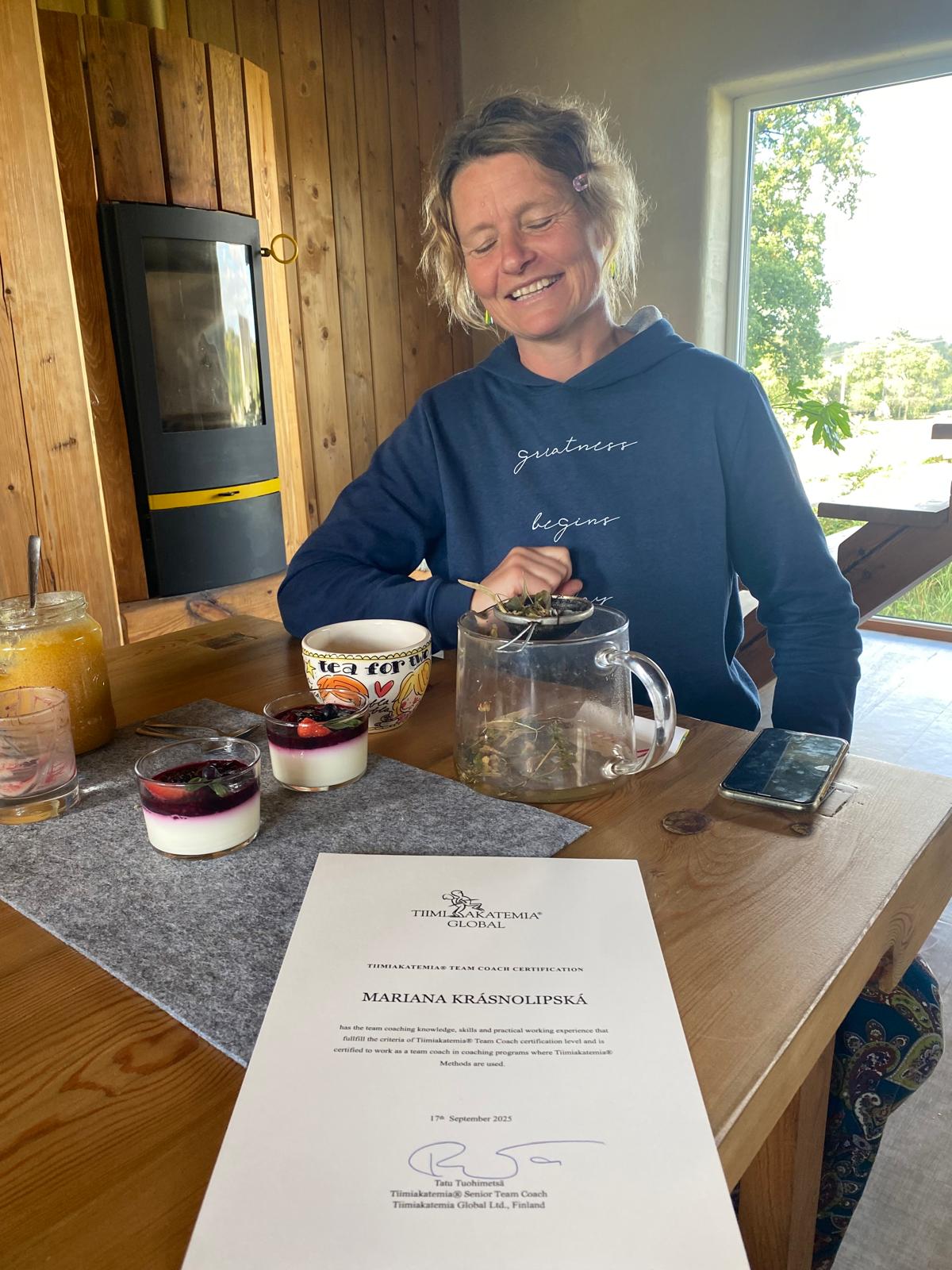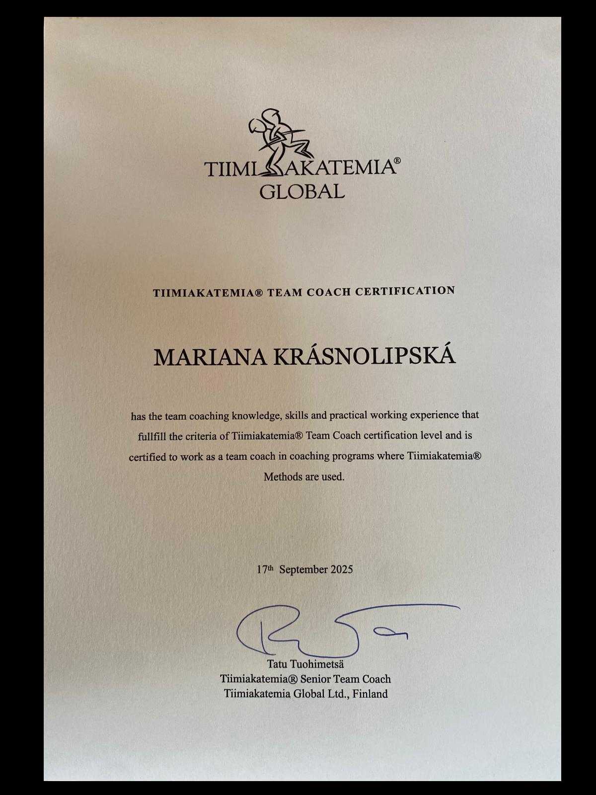 Mariana Krásnolipská je od 17. 9. 2025 oficiálně certifikovaná jako Team Coach Tiimiakatemia®. A to znamená, že už může podle metodiky Tiimiakatemia vést studentské týmy.